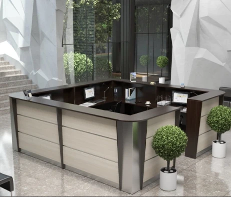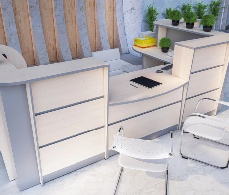 Необходимо было оснастить большой конференц-зал, кабинет директора и ресепшн мебелью в похожем стиле и цветах, но из разных ценовых категорий. Также поставлена задача подобрать соответствующие по цветам и размерам операционные тумбы и тумбы для оргтехники в оборудованные ранее кабинеты сотрудников. Важное условие заказчика – традиционный классический стиль мебели и темные цвета в деревянной фактуре.